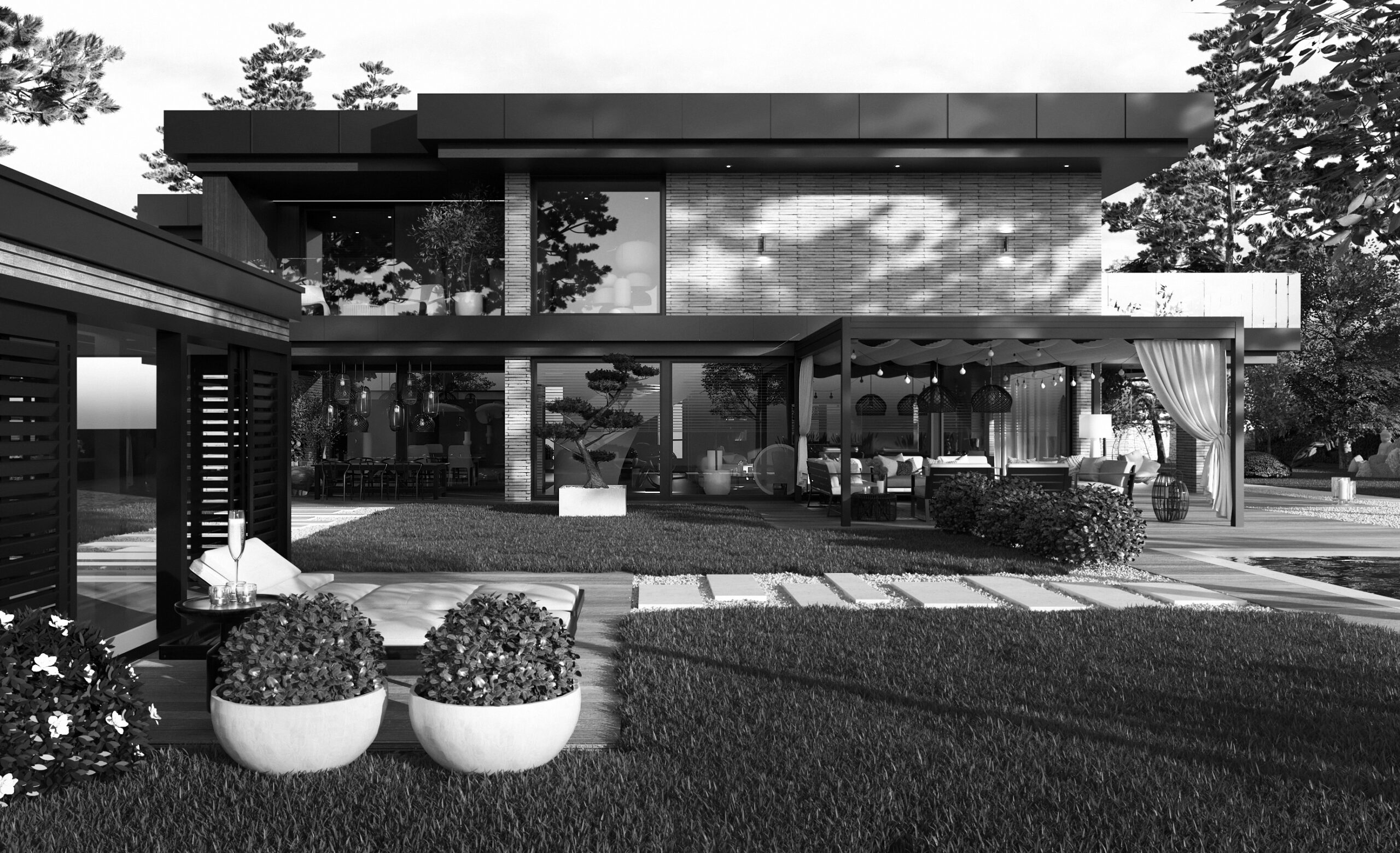 Założeniem Inwestorów było stworzenie nowoczesnego domu o prostej bryle, który będzie funkcjonalny i pełny światła. Punktem wyjścia do projektu była analiza możliwości zagospodarowania działki, chęć wykorzystania spadku terenu oraz „otwarcia się” tarasem na panoramę otaczającego krajobrazu. Tak powstał dom składający się z trzech prostopadłościennych, zwartych ze sobą brył. W jednej z nich mieści się dwustanowiskowy garaż wraz z pomieszczeniami technicznymi, w drugiej główna część mieszkalna a w trzeciej, sytuowanej na piętrze, część gościnna.